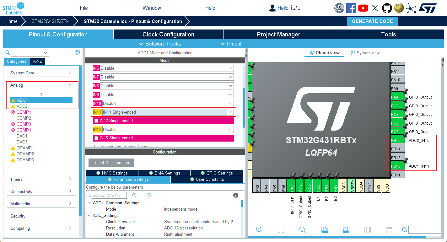 配置完成引脚后在Anlog的ADC1和ADC2内的输入通道勾上Single-ended